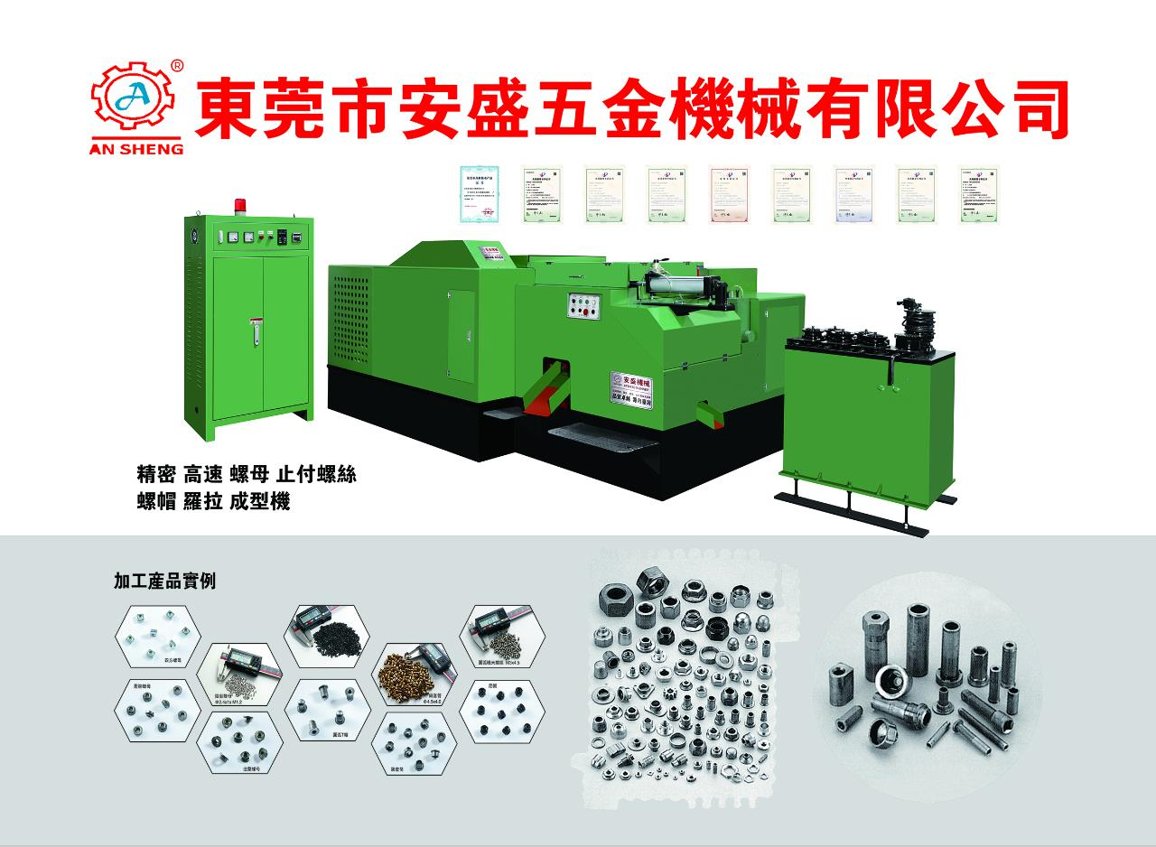 东莞市安盛五金机械有限公司(广东秉锋精密科技有限公司),位于广东省东莞市大朗镇,自建工厂占地面积15000平方米,是一家以中台合作制造螺母成型机、经销电脑车床(CNC)、自动车床、滚牙机、周边机器设备及五金零配件的五金机械制造公司。本公司制造的螺母成型机拥有多项技术专利,对以上机械类生产经销经验,在同行业中遥遥领先,以其雄厚的技术力量,可为不同的客户提供包括设备的产能配备分析、厂房设计、技术工人培训等服务,使客户的投资发挥出最高的效益,生产出及最能迎合市场需要的五金产品。同时也是一家集设计、研发、制造、加工爲一体的实力生産商。近几年为迎合市场需求,公司旗下研发了系列微小型五金産品的自动化设备,专业加工CD纹螺丝/高光面/法线纹螺丝,又成立了以专业设计生产锌、镁、铝合金压铸件为主的生产车间。公司一贯以“质量,服务至上”的宗旨,竭诚为您提供优质的服务。